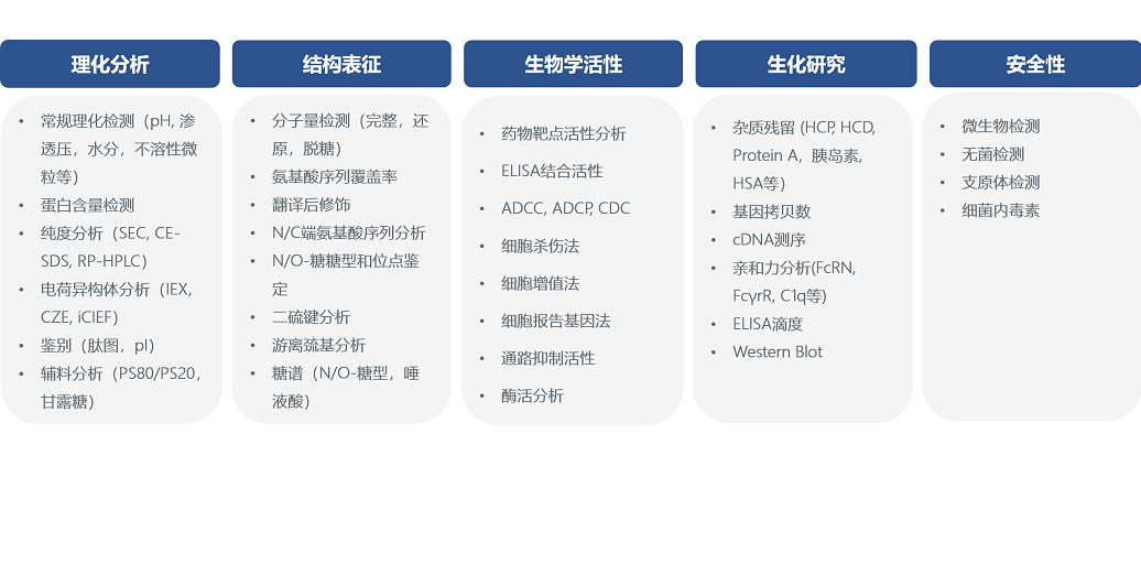 分析方法開(kāi)發(fā)團(tuán)隊(duì)擁有先進(jìn)的儀器設(shè)備,具備豐富的單抗,雙抗和重組蛋白等pCQA分析與監(jiān)控的經(jīng)驗(yàn),為新藥和仿藥研發(fā)以及IND/BLA申報(bào)提供一站式全流程服務(wù),包括: